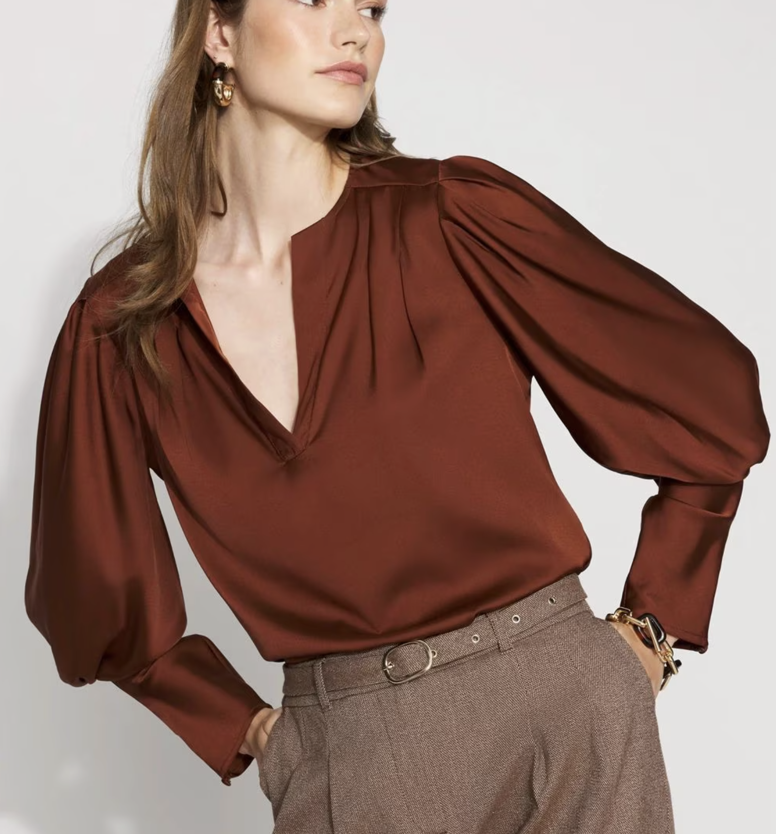 ▲ Own the room with the satin blouse featuring bold, pleated sleeves that refuse to be ignored. Whether it’s a power meeting or a cocktail hour, this blouse transforms your go-to pants into a show-stopping ensemble. Ready to turn heads and collect compliments? Slip into this statement piece and let your style do the talking—because subtlety is overrated.