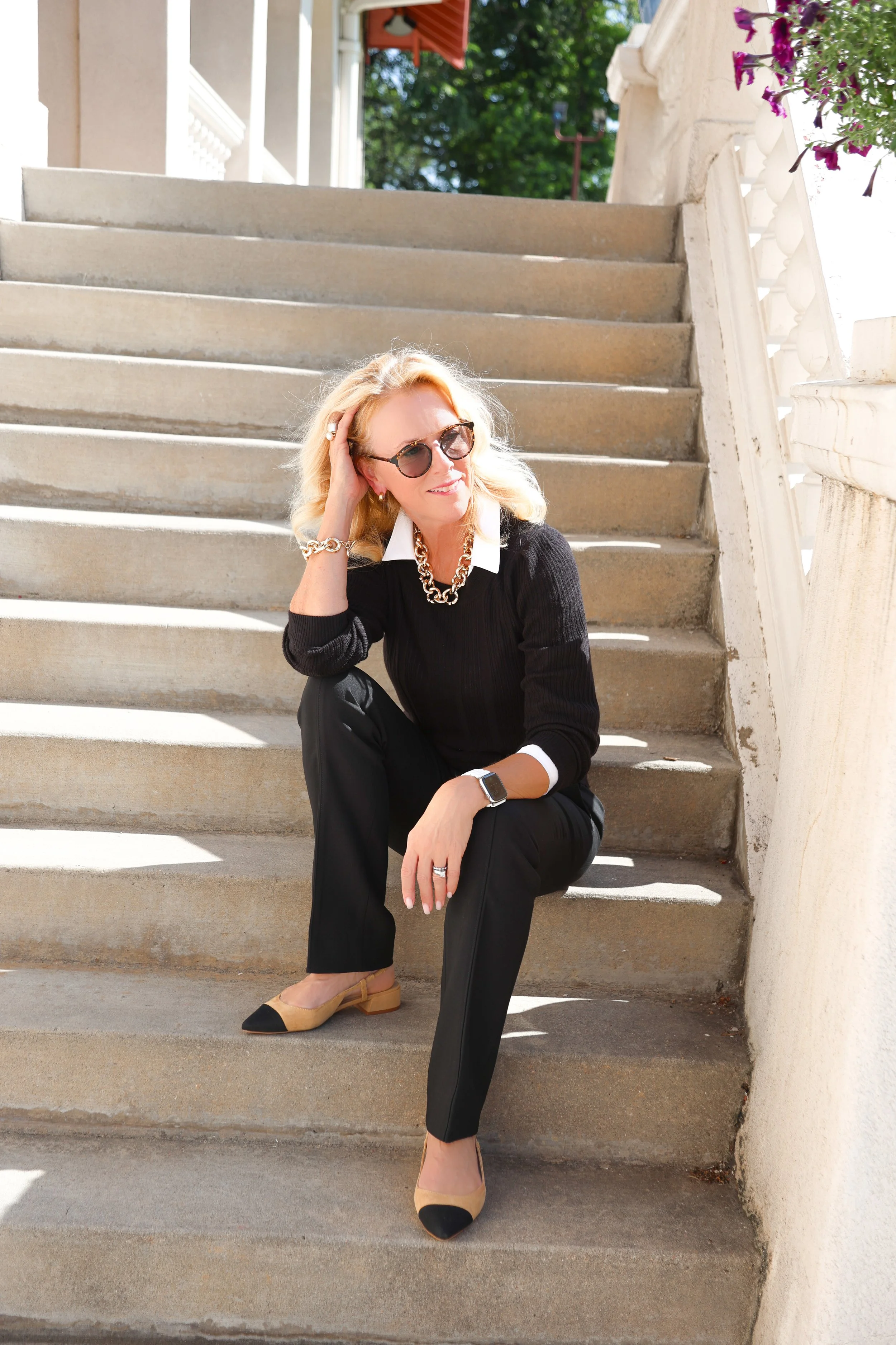 Upgrade your wardrobe effortlessly with versatile, comfortable pieces that take you from work to the weekend. Start with a relaxed crewneck in a beautiful cashmere blend. Next, wear a sleek button-up shirt for a polished, professional look, ideal for any workday. Combine these tops with high-rise waist trousers made from exclusive luxe double weave fabric. Complete your look with suede low-heels for all-day comfort and style, a bold yet lightweight chain link necklace, and a matching chunky bracelet. Elevate your style with these essential pieces that prioritize comfort and style, seamlessly taking you from work to the weekend.